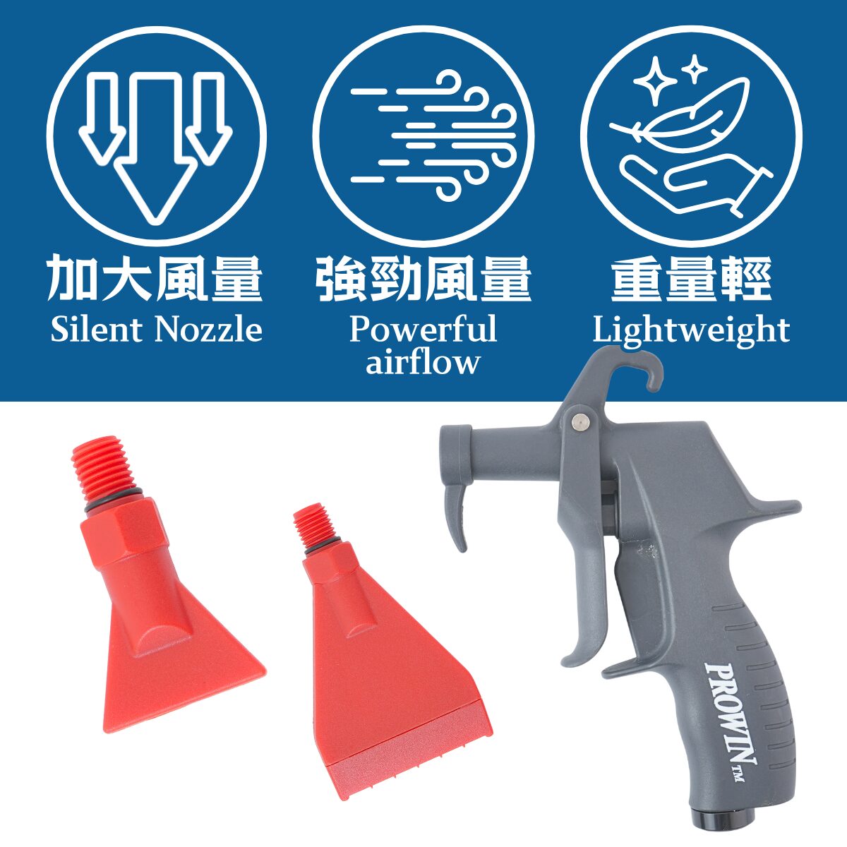 Prowin 氣動吹塵槍是一款高效能氣動清潔工具,搭載強勁風量輸出,可迅速將灰塵、碎屑與異物從表面與縫隙中吹除。可自由切換的專用吹嘴,能依不同清潔場景精準調整,無論是狹窄縫隙、複雜結構或大面積區域,都能輕鬆應對,大幅提升清潔效率。適用於汽車內裝、機械設備、工作環境與日常保養清潔,讓除塵作業更加快速、徹底且省力。