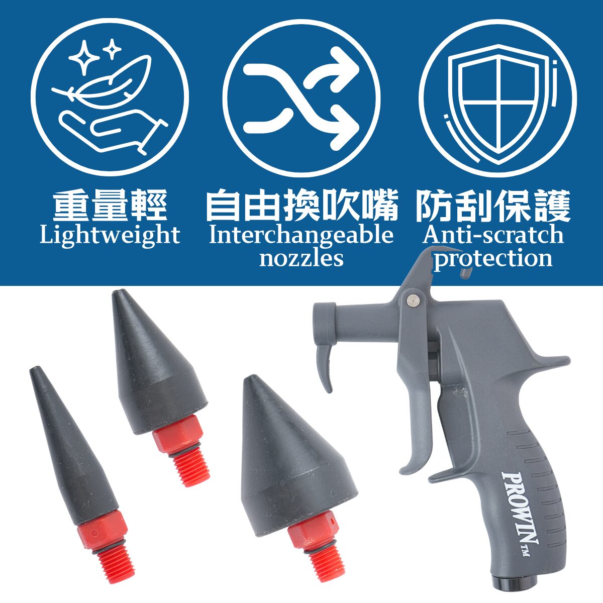 Prowin 氣動吹塵槍是一款高效能氣動清潔工具,搭載強勁風量輸出,可迅速將灰塵、碎屑與異物從表面與縫隙中吹除。可自由切換的專用吹嘴,能依不同清潔場景精準調整,無論是狹窄縫隙、複雜結構或大面積區域,都能輕鬆應對,大幅提升清潔效率。適用於汽車內裝、機械設備、工作環境與日常保養清潔,讓除塵作業更加快速、徹底且省力。