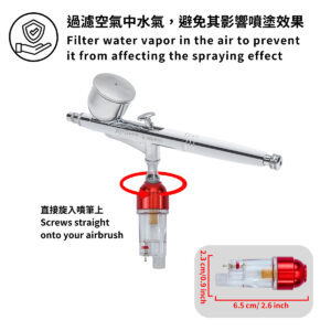 使用方式: 直接旋入噴筆即可使用,按壓彈簧洩水閥則可釋放噴筆內部的水氣。