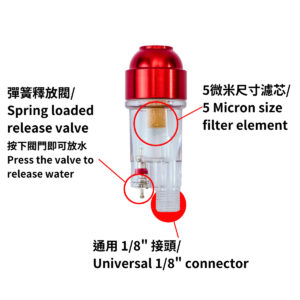 SG-07F-R 噴筆濾水器,5微米濾心可過濾空氣中的水氣,避免其影響噴塗效果,通用1/8″接頭。