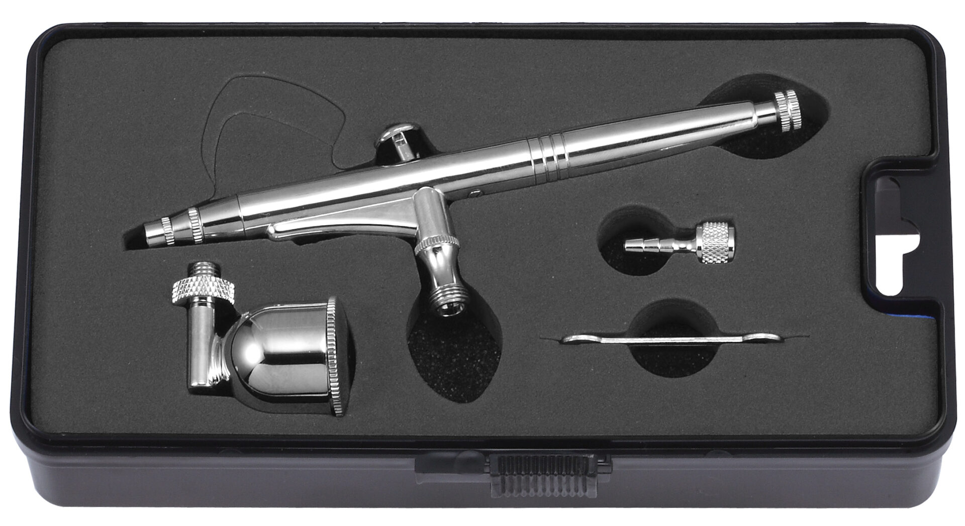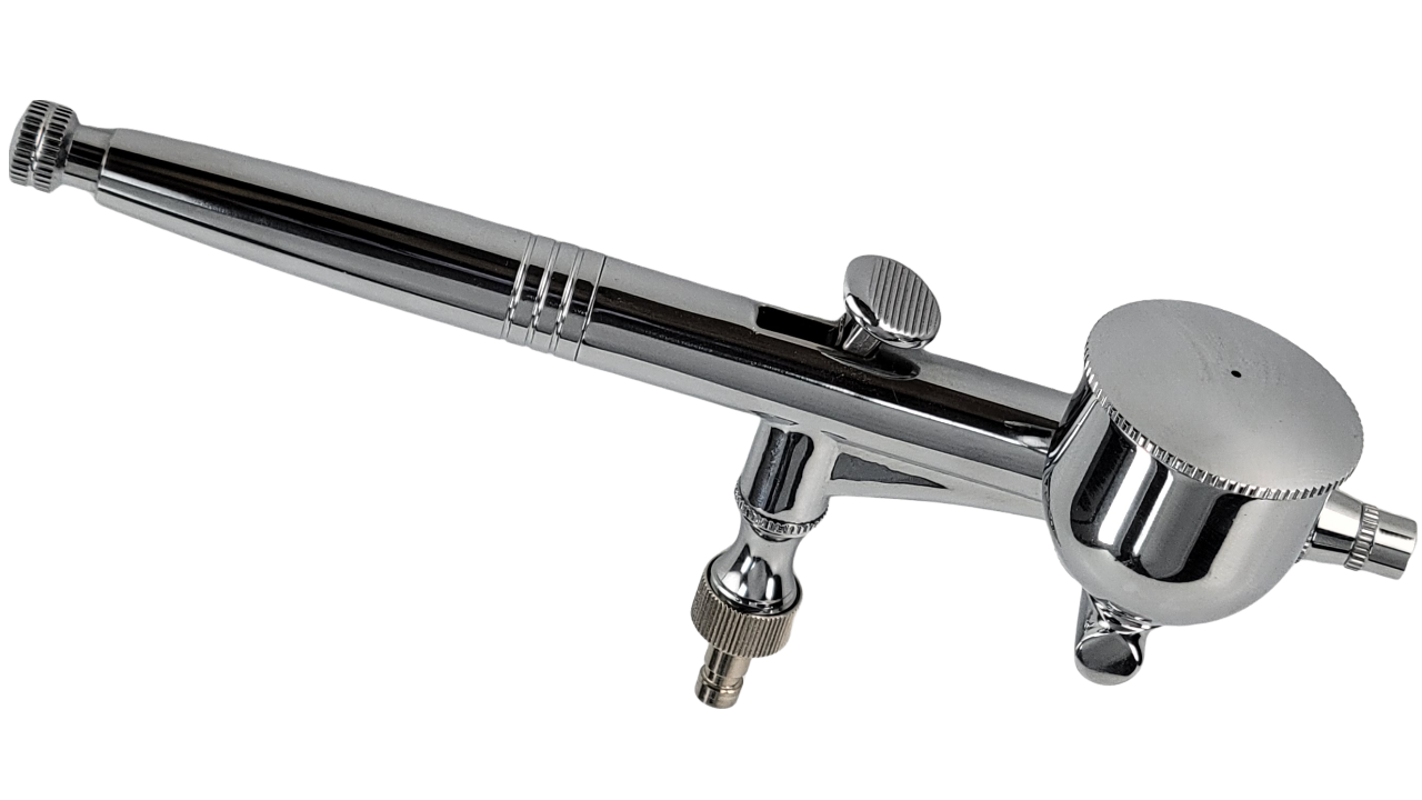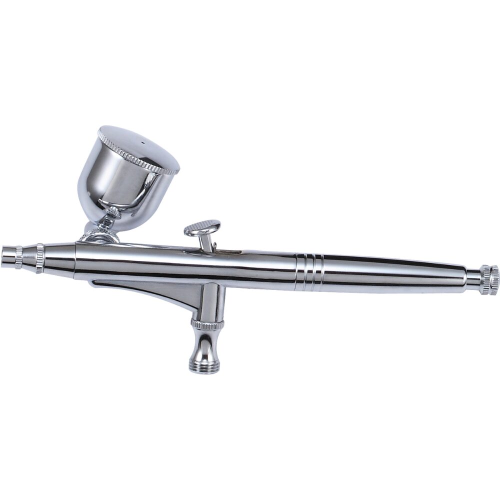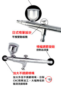 該氣動噴筆的加大不銹鋼噴嘴能降低拆裝清洗時的損壞率,並配有7ml側噴杯,在板機控制上有更大的空間,並利用噴杯鎖緊螺母的內螺牙能夠確保任何角度噴杯都能牢固鎖緊,根據噴塗物品調整噴杯角度。另外,調整噴幅旋鈕可以調整出漆量,搭配圓形針帽,能夠保護噴針。